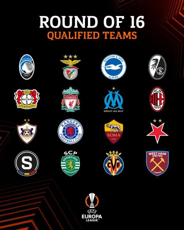 欧联杯小组赛头名晋级球队:西汉姆联、布莱顿、格拉斯哥流浪者、亚特兰大、利物浦、比利亚雷亚尔、布拉格斯拉维亚、勒沃库森